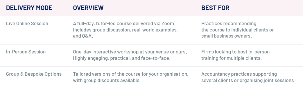 The online option starts from £275 + VAT per person, and we also offer group or bespoke sessions for practices that want to support multiple clients at once.